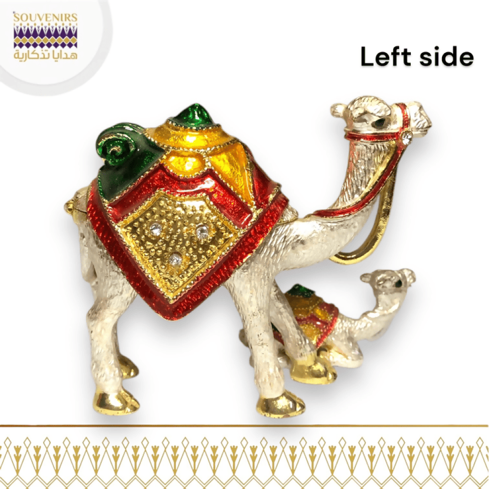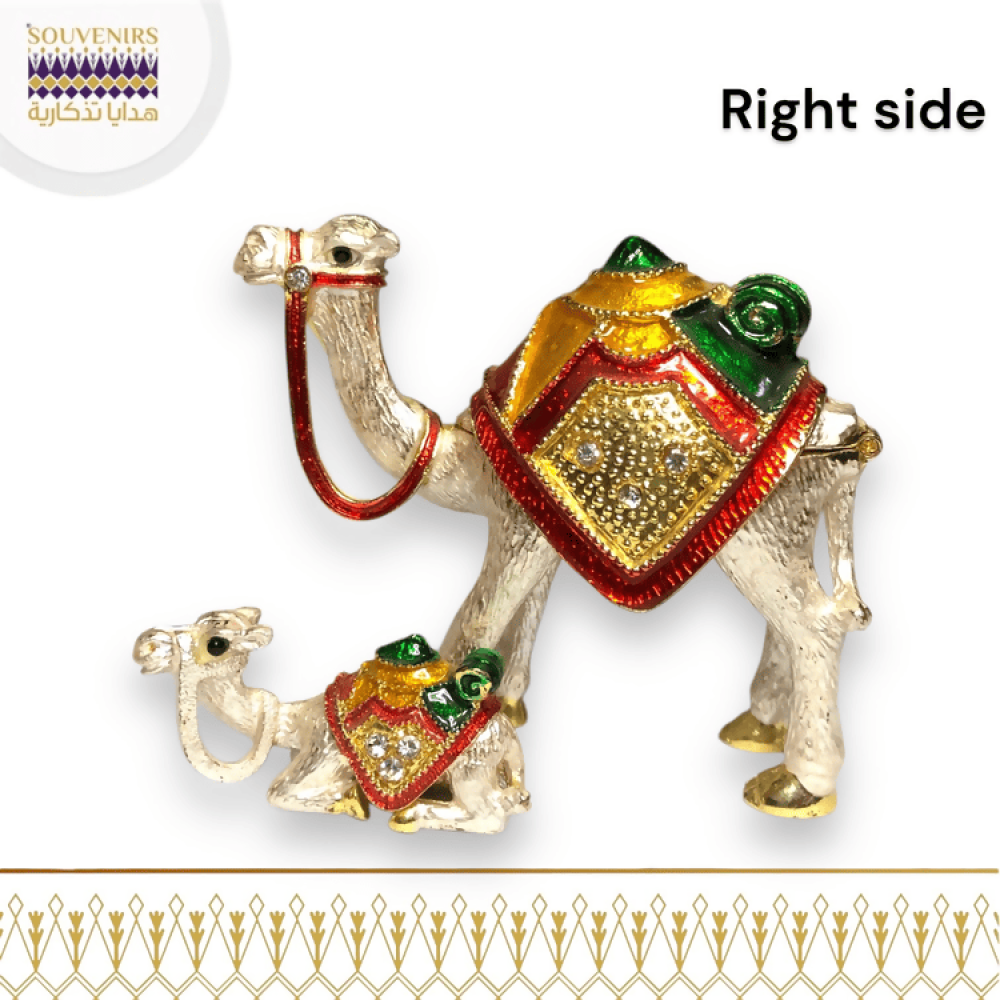 أضف لمسة من التراث السعودي إلى ديكور منزلك مع هذا المجسم الفاخر للجمل المصنوع من المعدن المطلي بألوان وزخارف فاخرة.