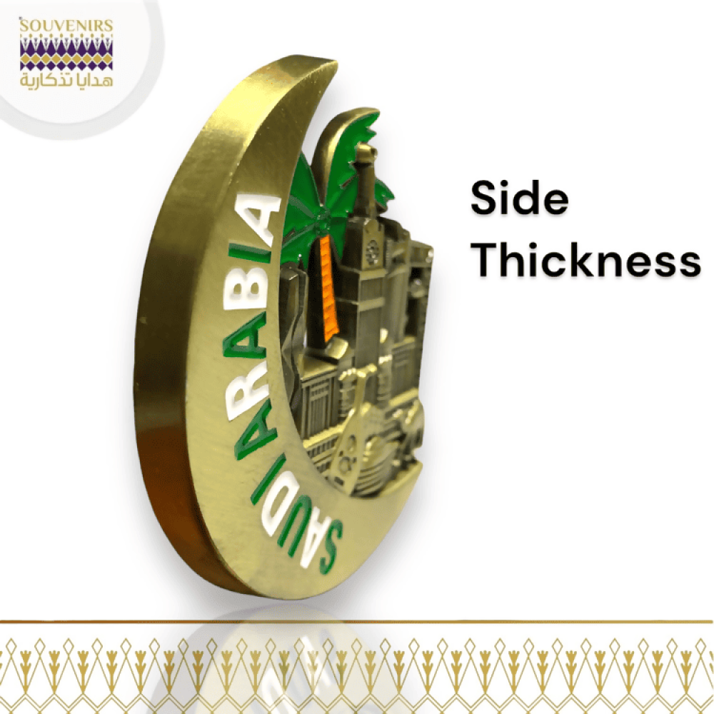 مصمم بشكل هلال يحتضن أبرز معالم المملكة العربية السعودية، مثل برج الساعة في مكة، أشجار النخيل، الجمل، والعود،