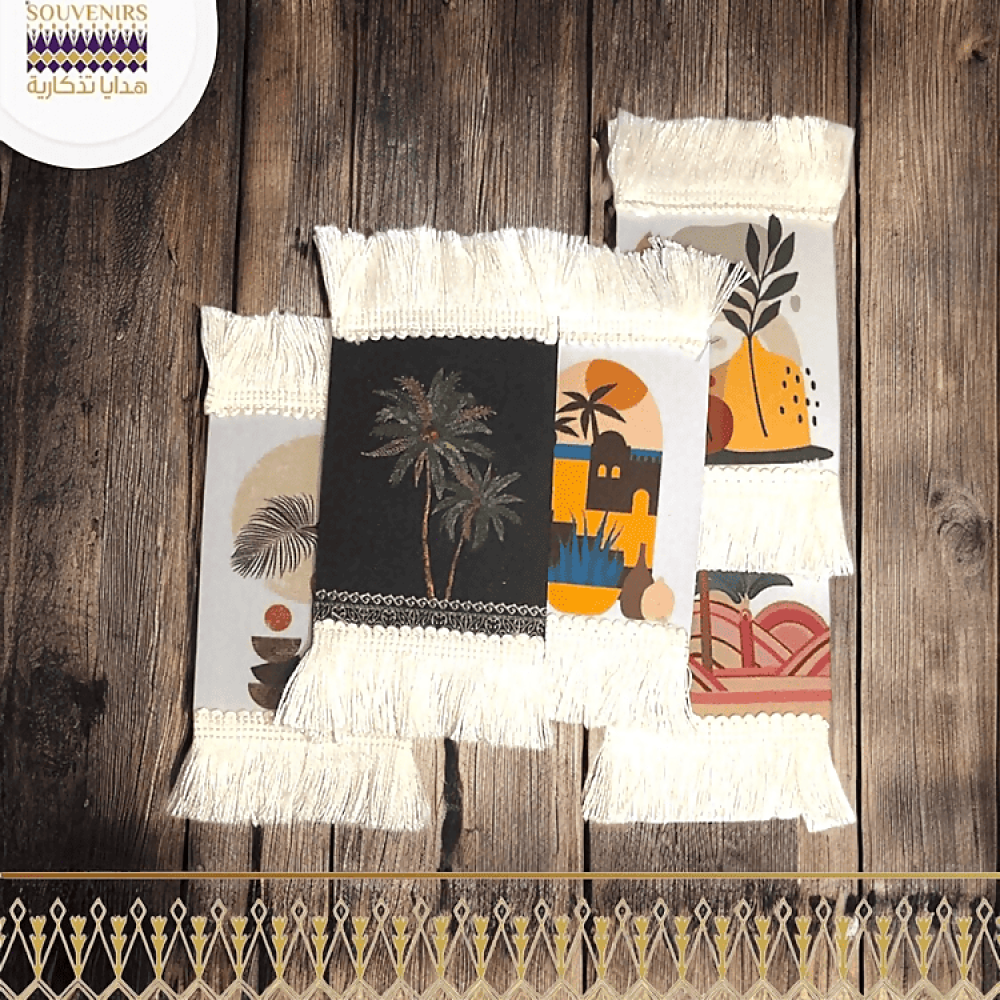 تأتي بألوان حيوية ورسومات جذابة، مثل النخيل والطبيعة الصحراوية والمعالم التقليدية، مع اطراف بيضاء تضيف طابعًا جذابًا.