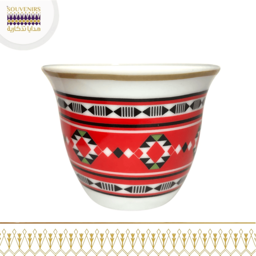 طقم فناجيل القهوة السعودية بنقش السدو، الذي يجسد روح الثقافة النجدية وجمال الحياة البدوية.