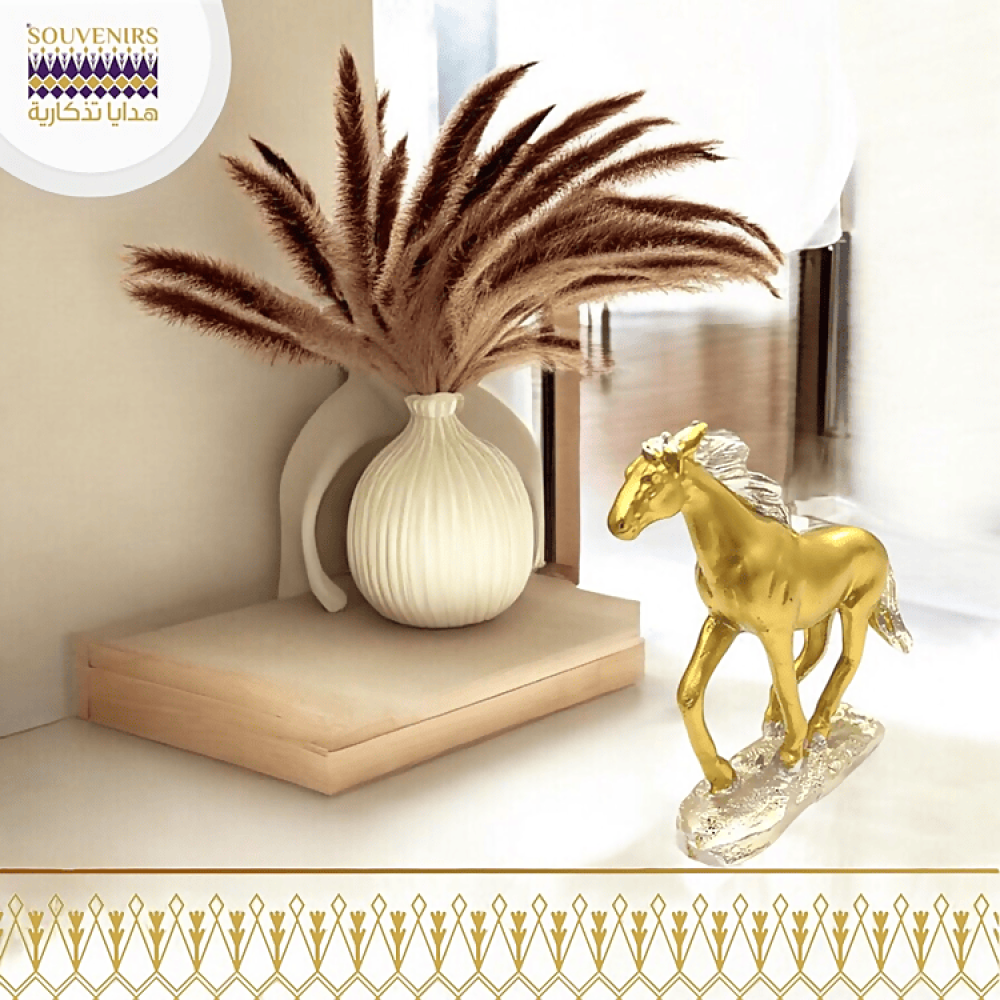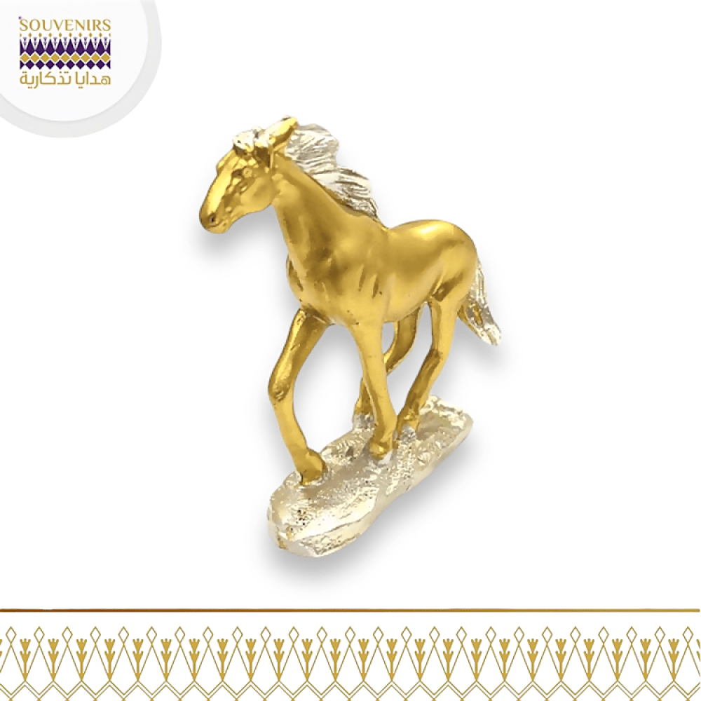 • تحفة خيل عربي ذهبي من هدايا تذكارية بتفاصيل فضية فاخرة تعكس القوة والجمال .