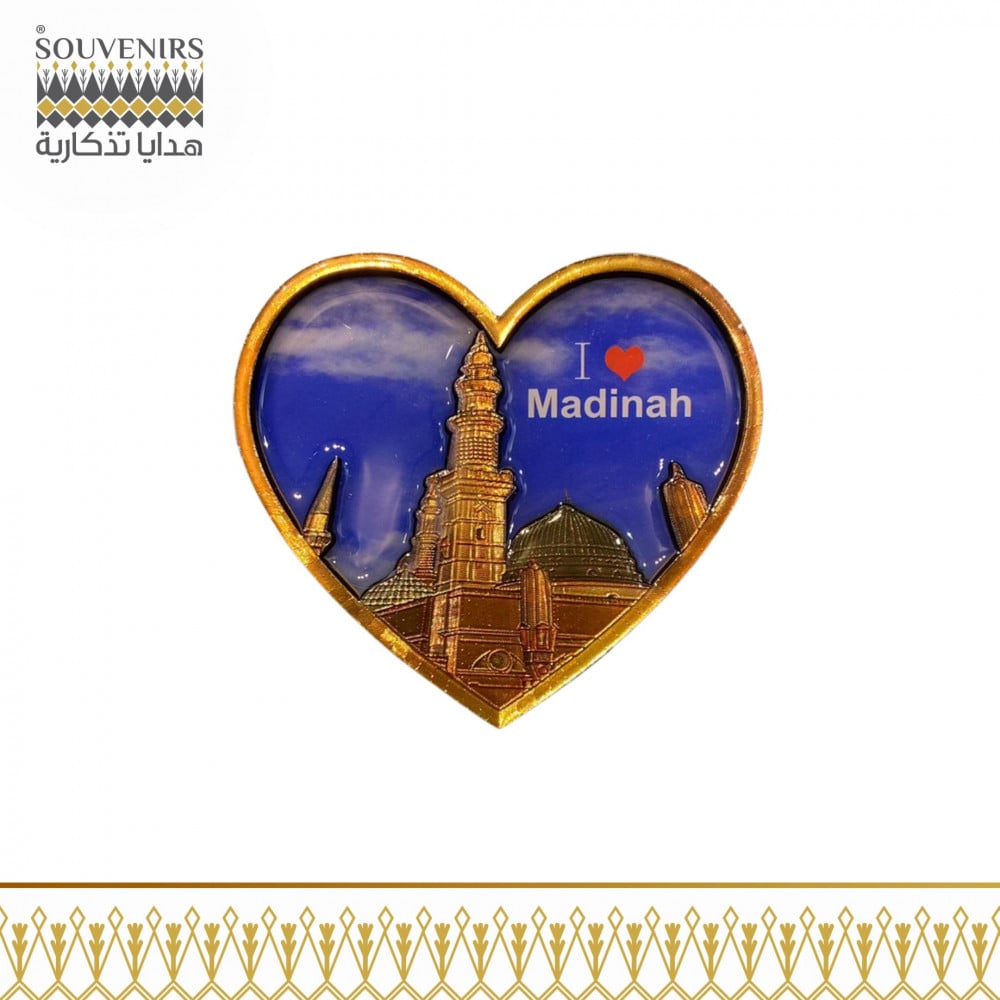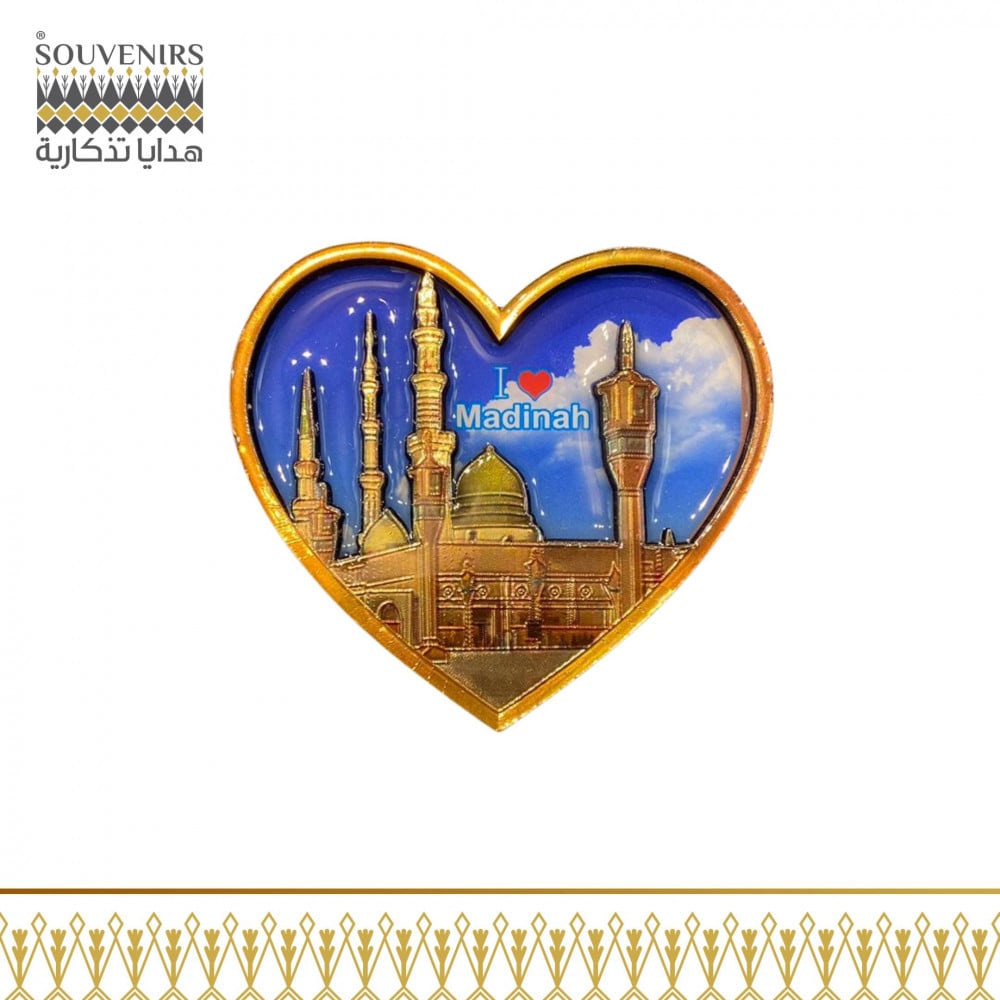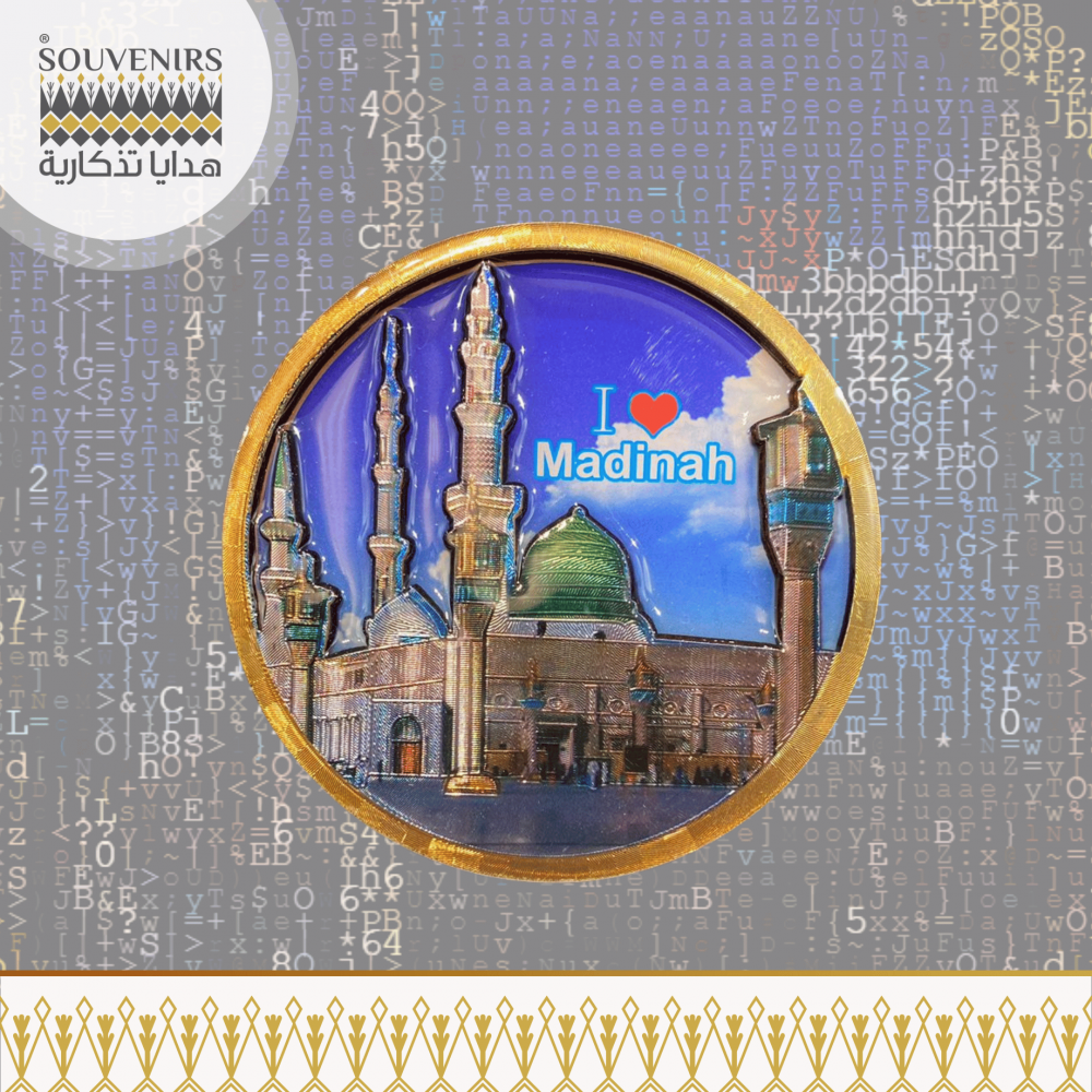 A 2D magnet made of wood with a picture of Al-Haram Al-Madani covered with resin with the phrase I love Madinah.